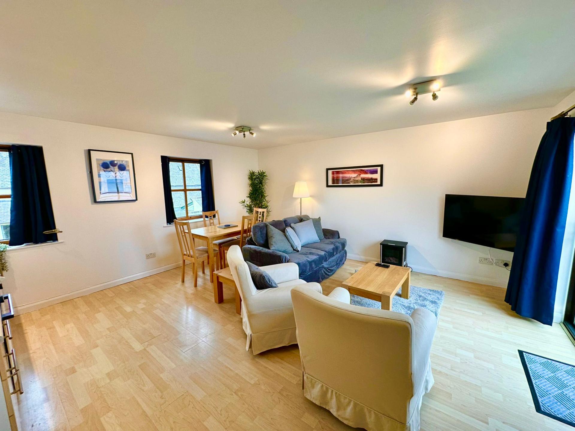 Eight minutes northeast of the Inverness airport, there's a small village of Ardesier with lovely Dolphin's Bay Suites well situated right on the Firth.Nice clean well maintained apartments of multiple sizes, most with kitxhens and porches. Great stay.